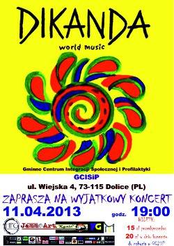 ZAPRASZMY WSZYSTKICH BARDZO SERDECZNIE NA KONCERT ZESPOŁU "DIKANDA", KTÓRY ODBĘDZIE SIĘ W DNIU 11.04. 2013 O GODZ.19.00 W GMINNYM CENTRUM INTEGRACJI SPOŁECZNEJ I PROFILAKTYKI W DOLICACH.TRWA PRZEDSPRZEDAŻ BILETÓW W CENIE 15 ZL. CENA BILETU W DNIU KONCERTU 20 ZŁ. SERDECZNIE ZAPRASZAMY.