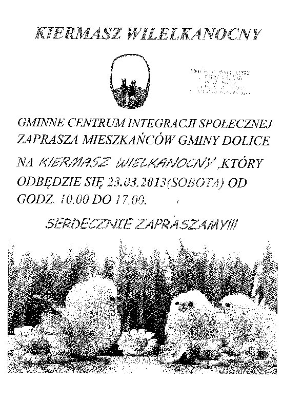 ZAPRASZAMY WSZYSTKICH NA KIERMASZ WIELKANOCNY W SOBOTĘ 23.03.2013 R OD GODZ.10.00 DO 15.00. KIERMASZ ODBĘDZIE SIĘ W GMINNYM CENTRUM INTEGERACJI SPOŁECZNEJ I PROFILAKTYKI, UL. WIEJSKA 4